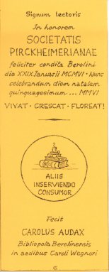 Ein Lesezeichen zum Pirckheimer-Jubiläum. Das Lesezeichen (Signum lectoris) eines gewissen Carolus Audax, Berliner Buchhändler in Firma Carl Wegner, das beim Jubiläumstreffen am 29. Januar auslag oder dem Almanach beigegeben wurde, bedarf wohl nachträglich einer Erklärung, zumindest für die Nicht-Lateiner unter den Mitgliedern. Ich erinnere an die frühere Idee „Jedem Pirckheimer sein Lesezeichen!“ – realisiert von XAGO mit seiner „Grille“ als Beilage zu Heft 166, 2002 der Marginalien. Mangels solcher künstlerischer und originalgraphischer Möglichkeiten versuchte ich, ihm auf andere Art nachzueifern. Es lag nahe, dem bibliophilen Humanisten und Namenspatron der „Pirckheimer“ in seiner Sprache zu huldigen: also zu Ehren der Gesellschaft („in honorem Societatis …“), glückhaft gegründet in Berlin am 29. Januar 1956